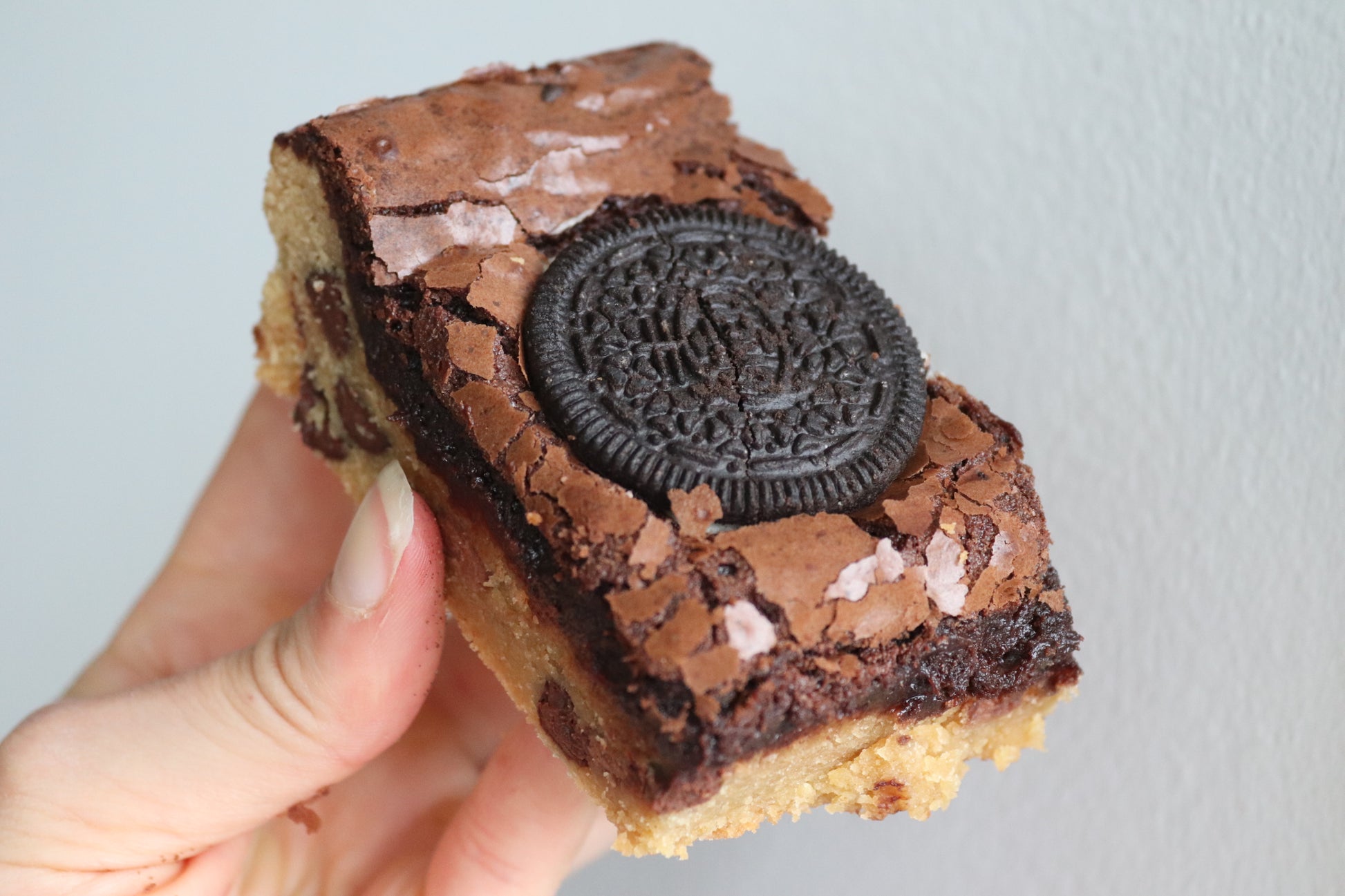 En nydelig combo av chocolate chip cookie og gooey brownie med Oreo😍. Den er mektig, men sykt digg. Om du elsker sjokolade er denne for deg!