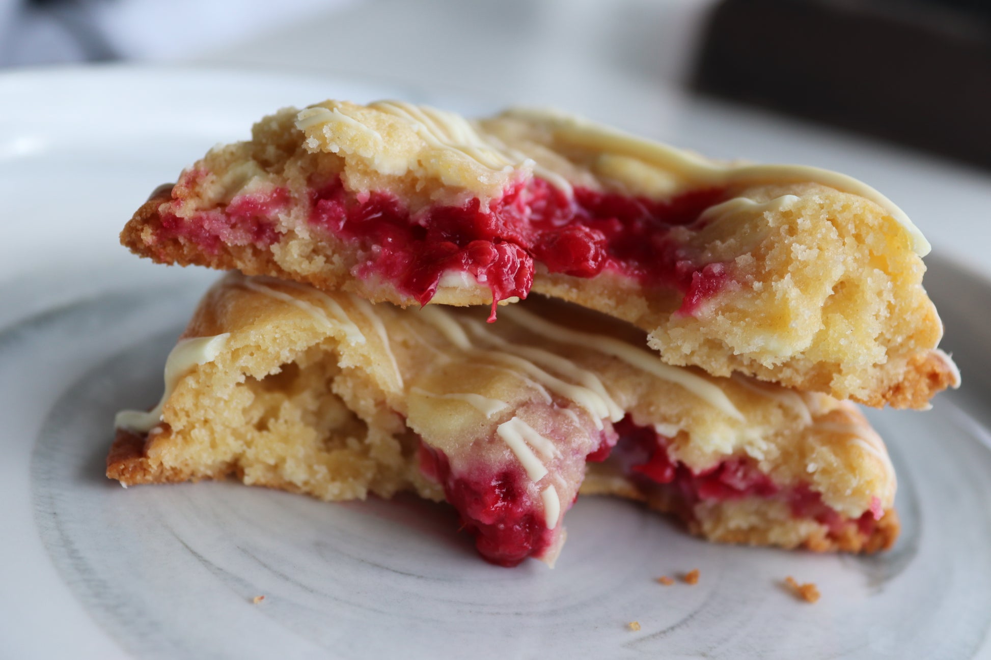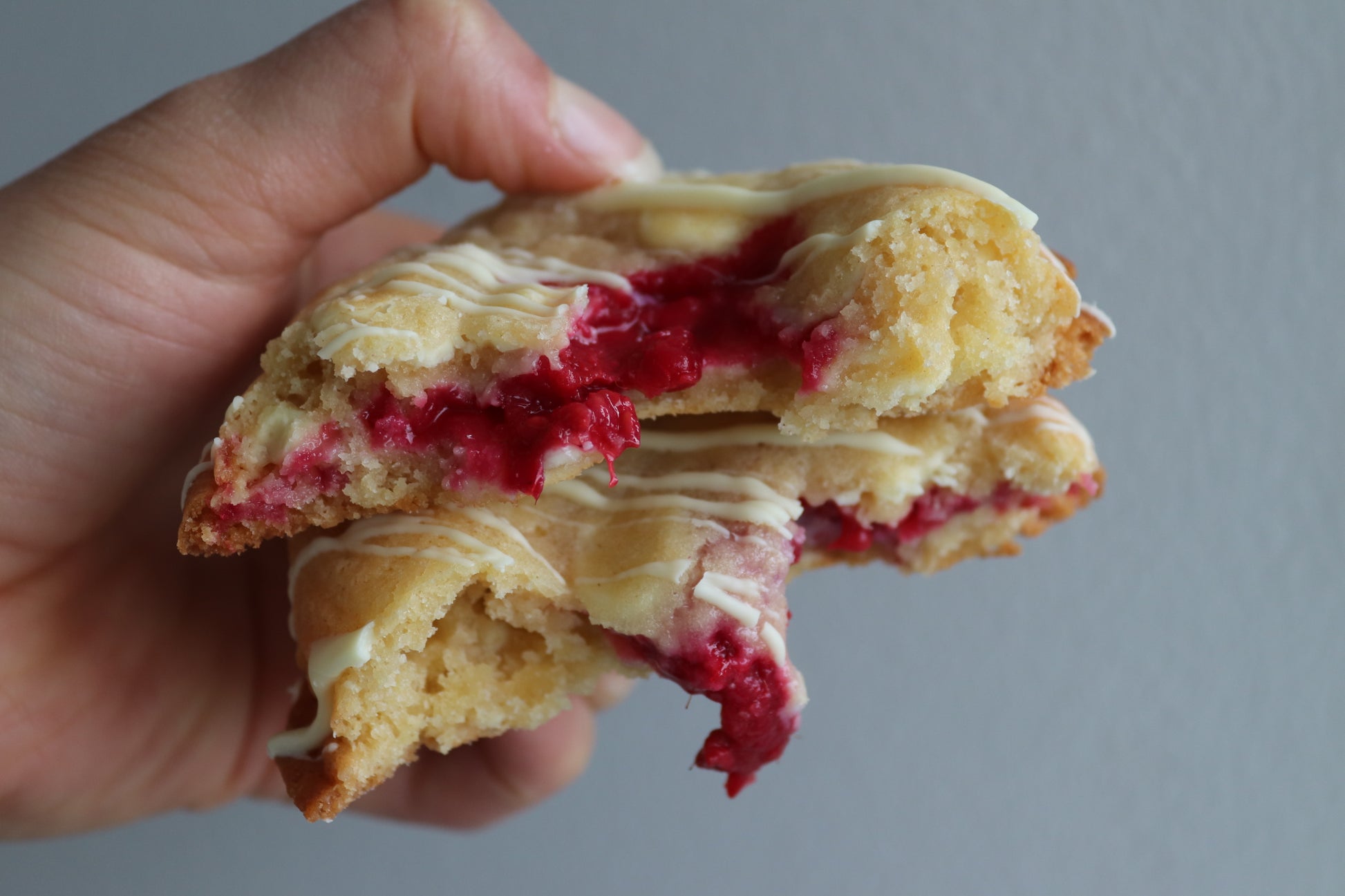 Frisk cookie av lys smørdeig fylt med bringebær og fyldig belgisk hvit sjokolade